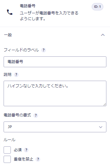 - 追加した電話番号フィールドの一般設定の「電話番号の書式」で「JP」を選択します。