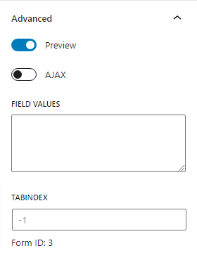 ライブプレビューを有効にするには、Gravity Forms ブロックをクリックし、Advanced セクションを開いて Preview をオンに切り替えます。