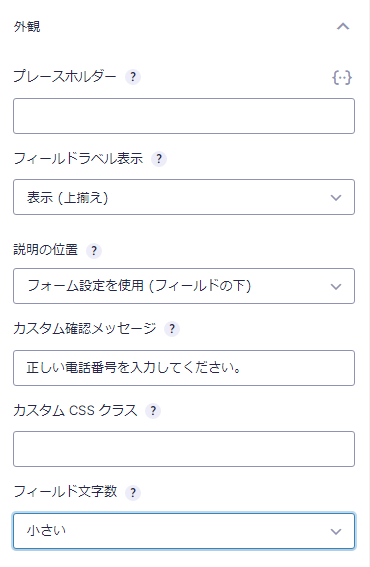 「外観」の「カスタム確認メッセージ」でエラー時のメッセージを設定します。(デフォルトでは英語でエラー文言を表示します。)