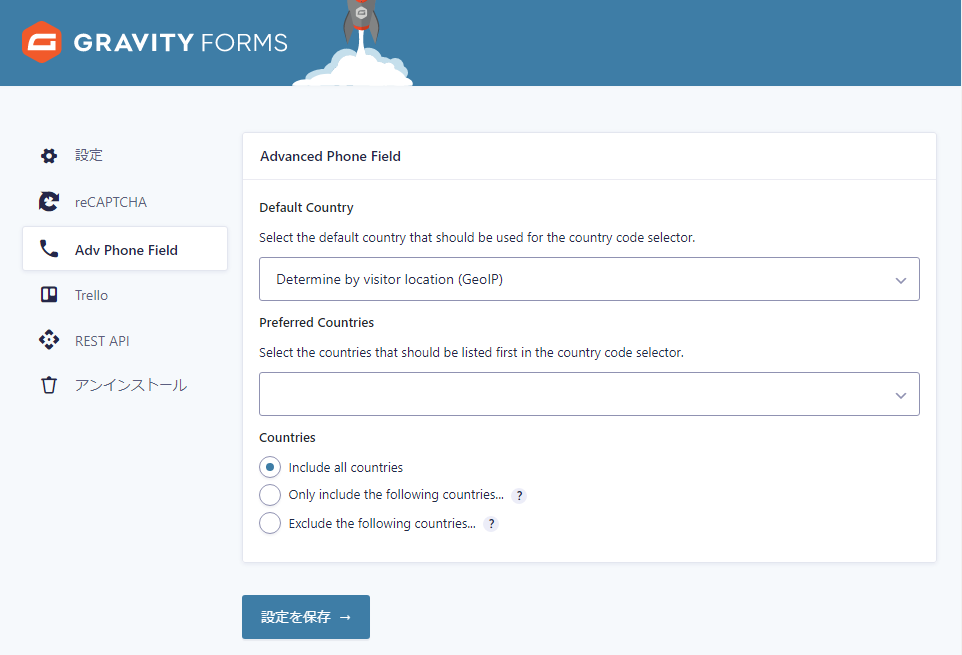 ドロップダウンでデフォルトの国を設定することも可能ですが、デフォルトでは「訪問者の位置(GeoIP)で判断する」が選択されています。