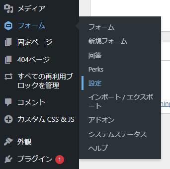 WordPress 管理画面の左メニューから「フォーム」>「設定」を選択します。