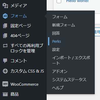 WordPress の管理画面左メニューから、「フォーム」>「Perks」を選択します。
