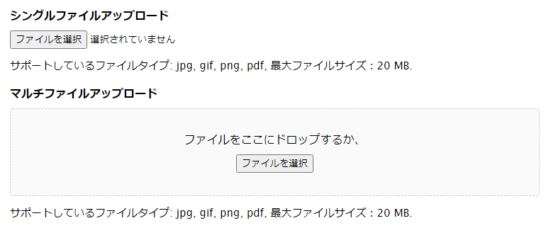ファイルアップロードフィールドの表示例(シングルファイル・マルチファイル)