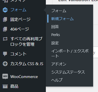 WordPress 左側メニューから、「フォーム > 新規フォーム」を選択します。