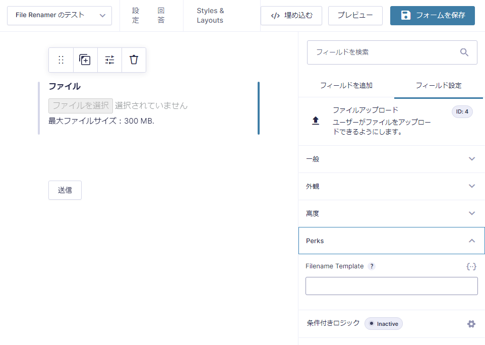 ファイルアップロードフィールドを選択した状態で、「フィールド設定」タブを開き、「Perks」メニューを開きます。