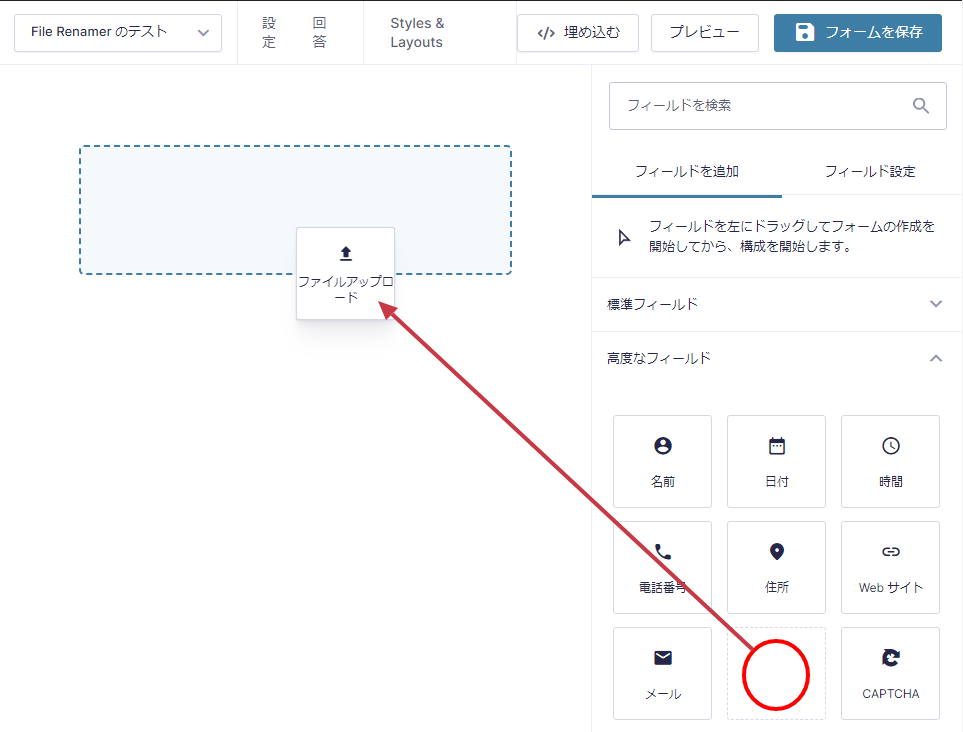 次にフォームエディターの「高度なフィールド」で「ファイルアップロード」フィールドをドラッグアンドドロップで設置します。